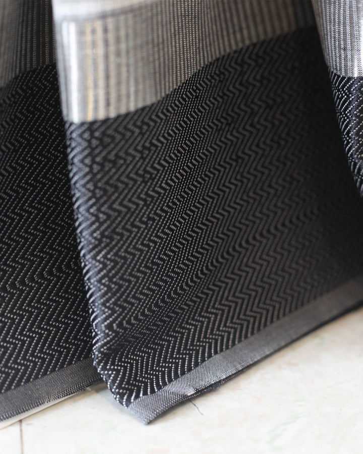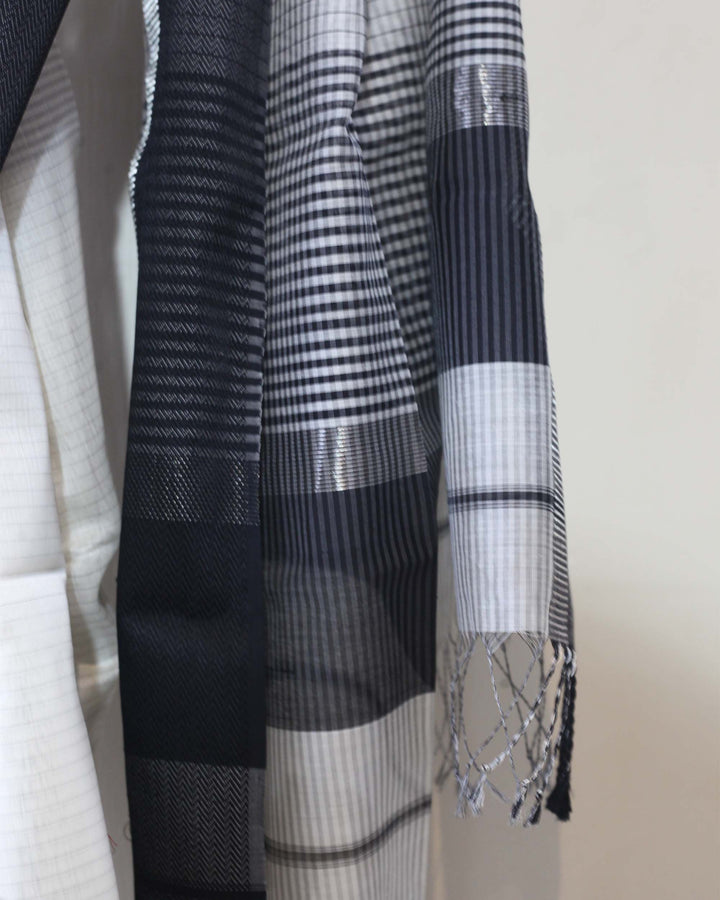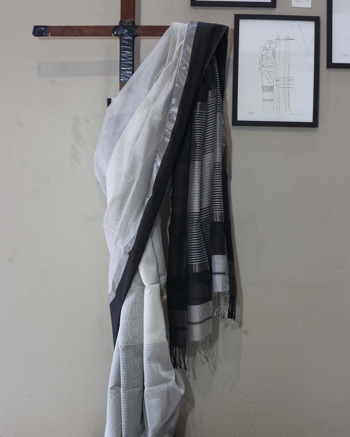 A timeless blend of tradition and modernity — this black and white Maheshwari saree, handwoven in silk-cotton with a silver and black rations border, embodies effortless elegance in every thread.