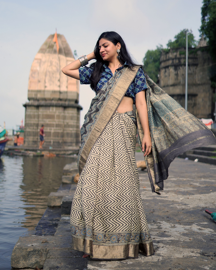 An exquisite blend of two age-old crafts — Ajrakh printing and Maheshwari weaving, where pure Mulberry silk becomes the canvas for natural light and hand-printed Ajrakh patterns, celebrating the timeless harmony of tradition and innovation.