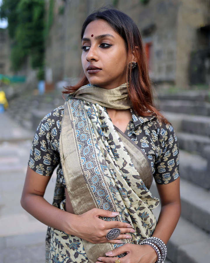 The saree features a subtle AJRAKH a delicate play of natural tones and patterns that emerge beautifully under natural light — creating an almost dreamlike transition of shades. It’s an exploration of how silk breathes and transforms with light, giving the fabric an organic, living texture.