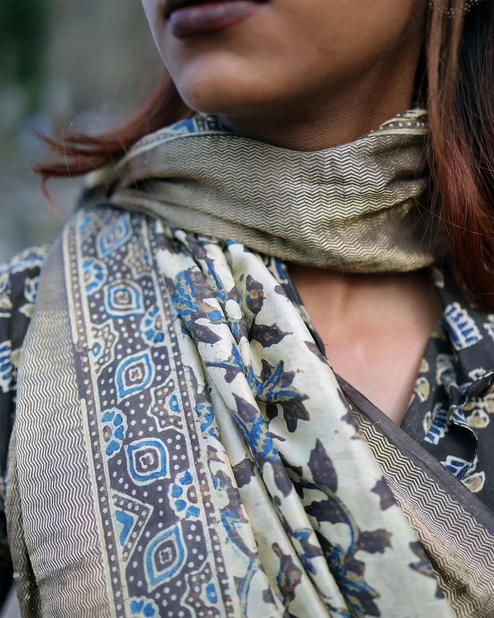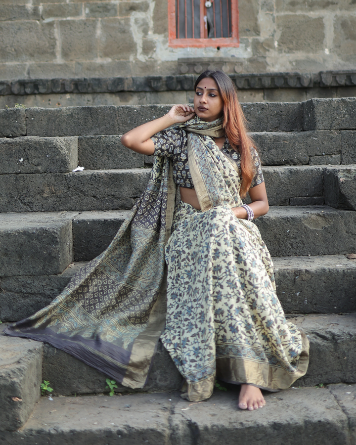 An exquisite blend of two age-old crafts — Ajrakh printing and Maheshwari weaving, where pure Mulberry silk becomes the canvas for natural light and hand-printed Ajrakh patterns, celebrating the timeless harmony of tradition and innovation.