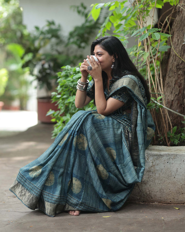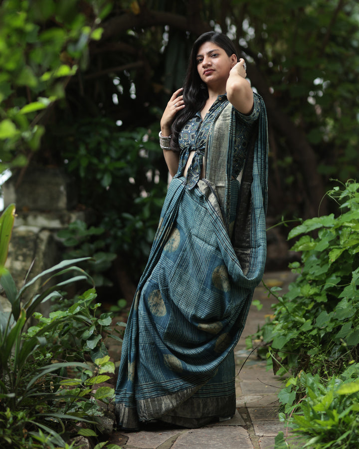 An exquisite blend of two age-old crafts — Ajrakh printing and Maheshwari weaving, where pure Mulberry silk becomes the canvas for natural light and hand-printed Ajrakh patterns, celebrating the timeless harmony of tradition and innovation.