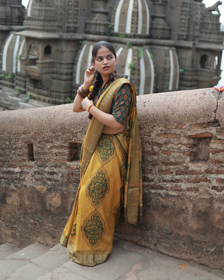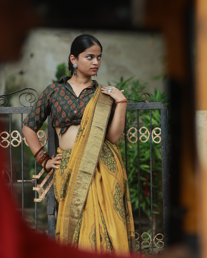 An exquisite blend of two age-old crafts — Ajrakh printing and Maheshwari weaving, where pure Mulberry silk becomes the canvas for natural light and hand-printed Ajrakh patterns, celebrating the timeless harmony of tradition and innovation.
