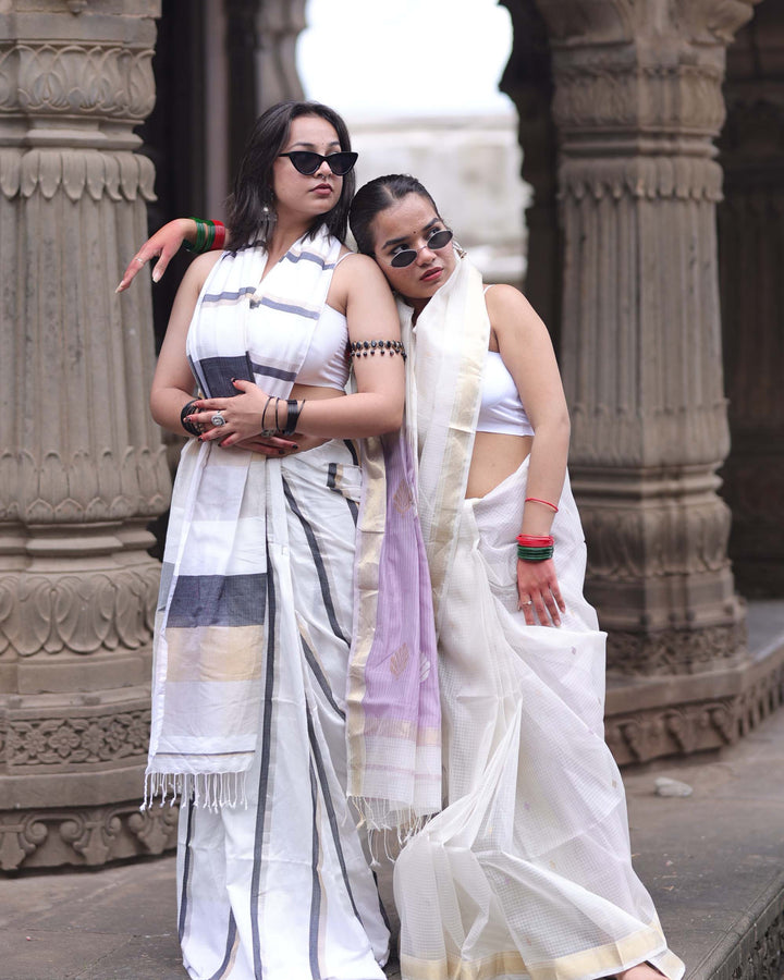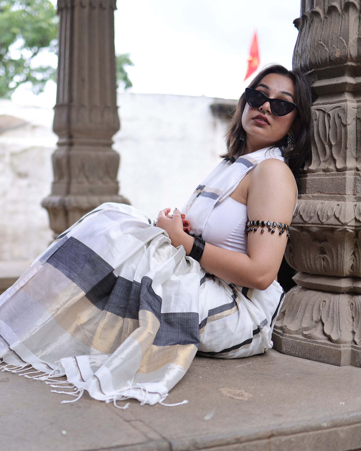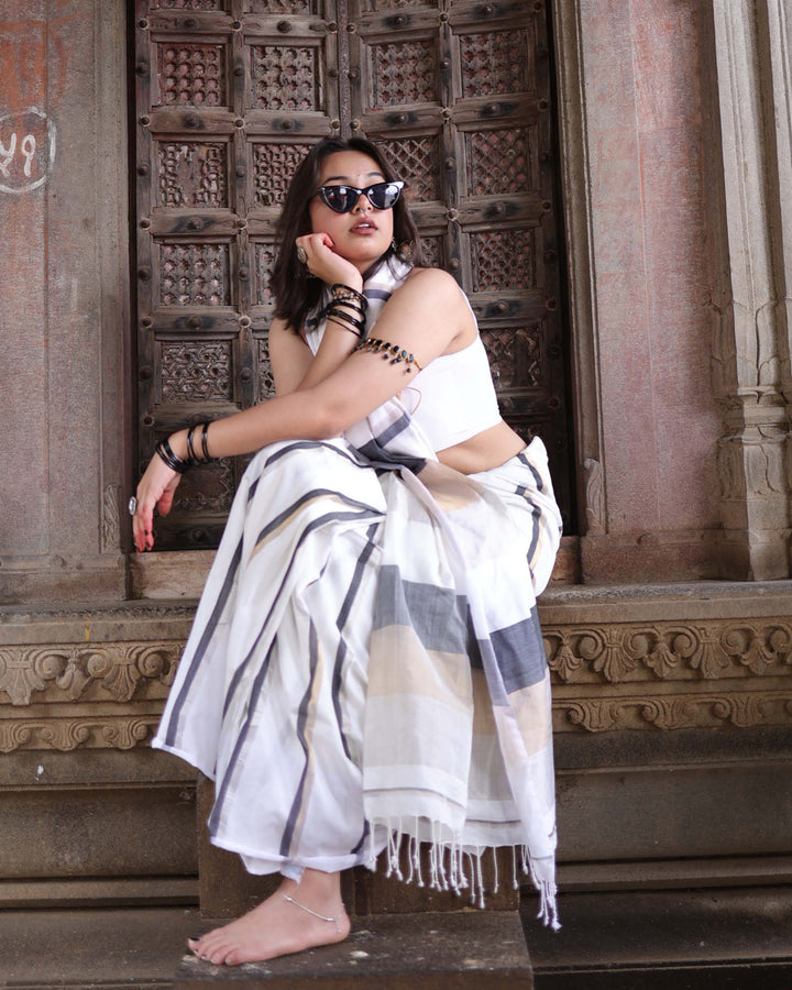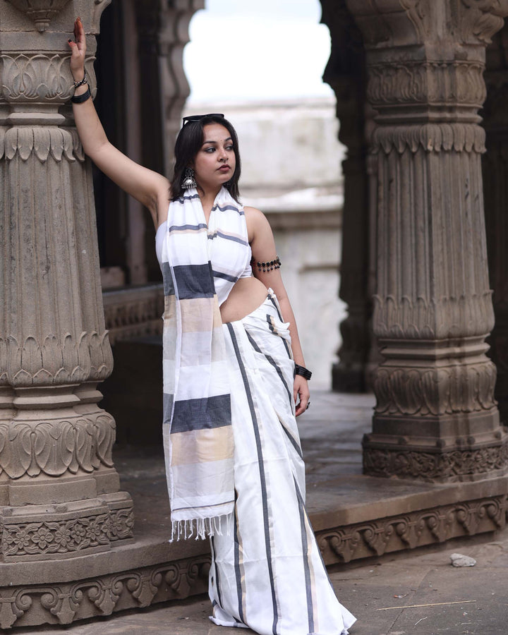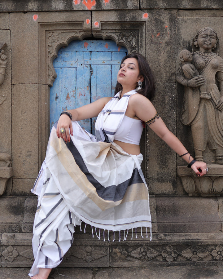 This pure cotton Maheshwari saree in black and white offers a perfect blend of tradition and modern minimalism. Woven in a 4-twill construction, it carries a subtle texture that enhances its fluid drape and structure. The monochrome palette keeps the design timeless yet contemporary, making it suitable for everyday elegance as well as refined occasions. Lightweight, breathable, and effortlessly graceful, this saree is designed for comfort without compromising sophistication. Its simplicity allows the craftsmanship and weave to speak for itself — making it a versatile addition to a thoughtful wardrobe.