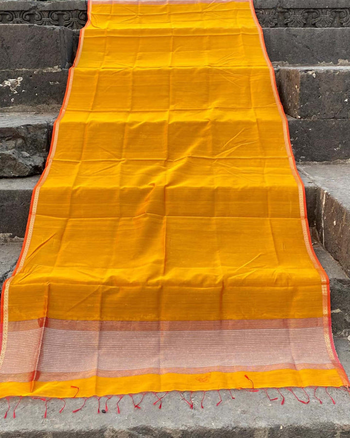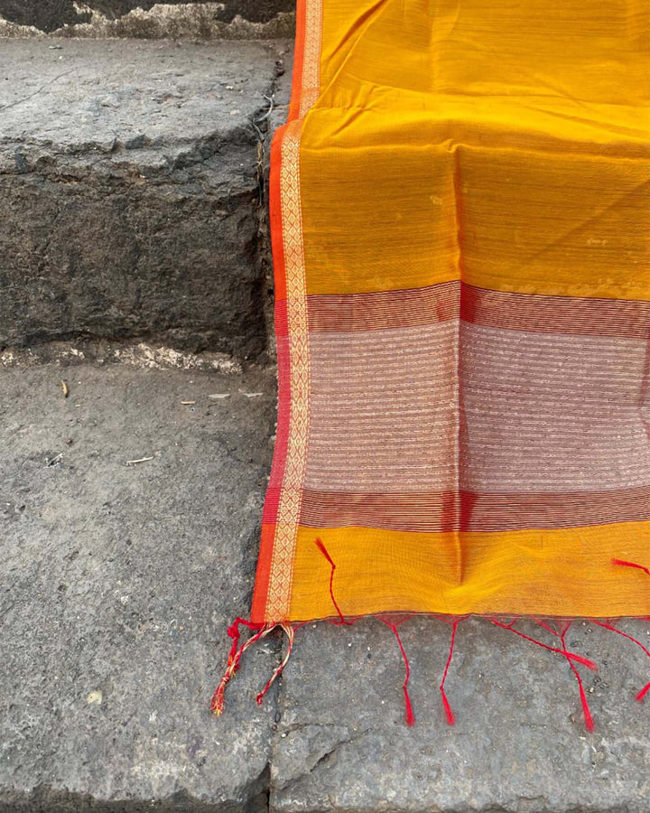 Jari diamond border a touch of maheshwar fort carvings weaved with golden jari. Crafted in a soft silk–cotton blend, lightweight, crisp, and comfortable for long wear. Vibrant yet refined, this piece is perfect for festive occasions, celebrations, or anyone who loves classic handloom with a hint of artistry.