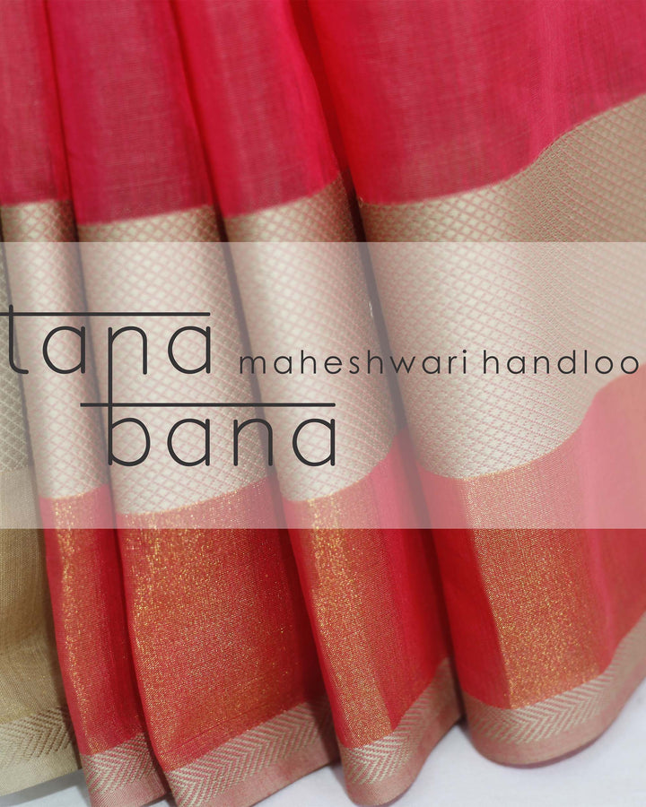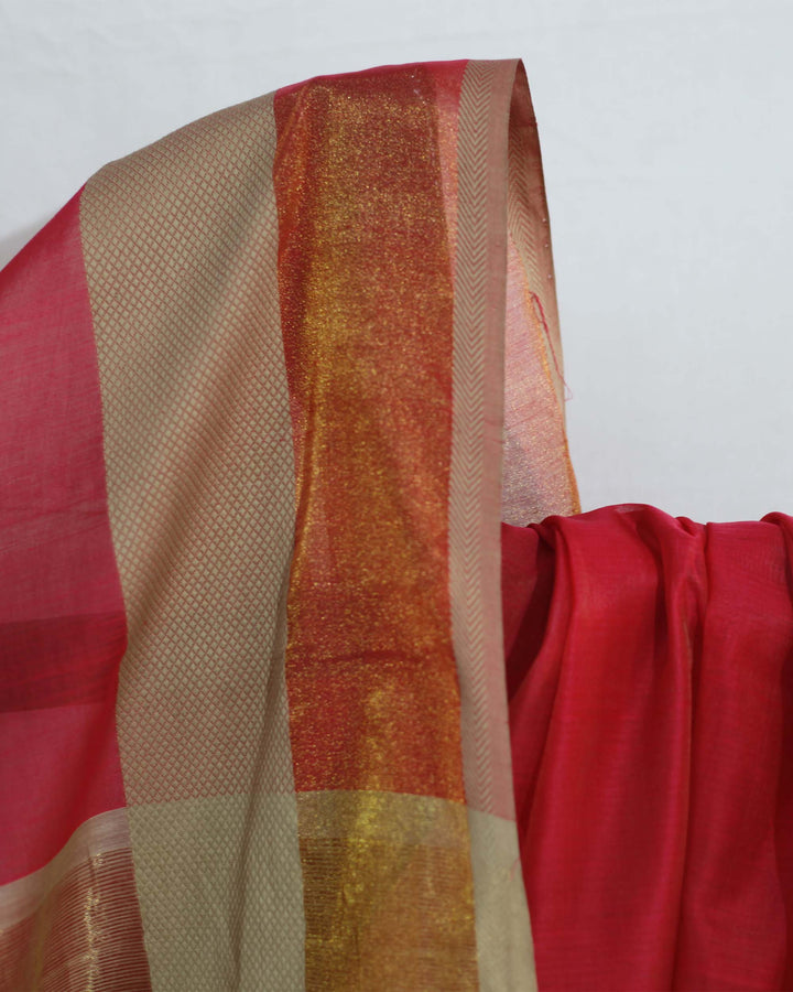 The saree features a vibrant reddish-pink base paired with elegant golden-beige borders and pallu, which add a rich contrast and regal feel to the overall look. The border is adorned with a classic zari work in soft gold, complemented by touches of rust and a subtle shimmer that elevates its elegance. The pallu showcases linear golden stripes and a woven effect, giving it a sophisticated yet understated appeal. The texture appears soft and slightly sheer, characteristic of Maheshwari silk-cotton blends, making it lightweight and comfortable for a variety of occasions. Distinctive tassels at the end add a charming finishing touch, suitable for both festive and formal wear.