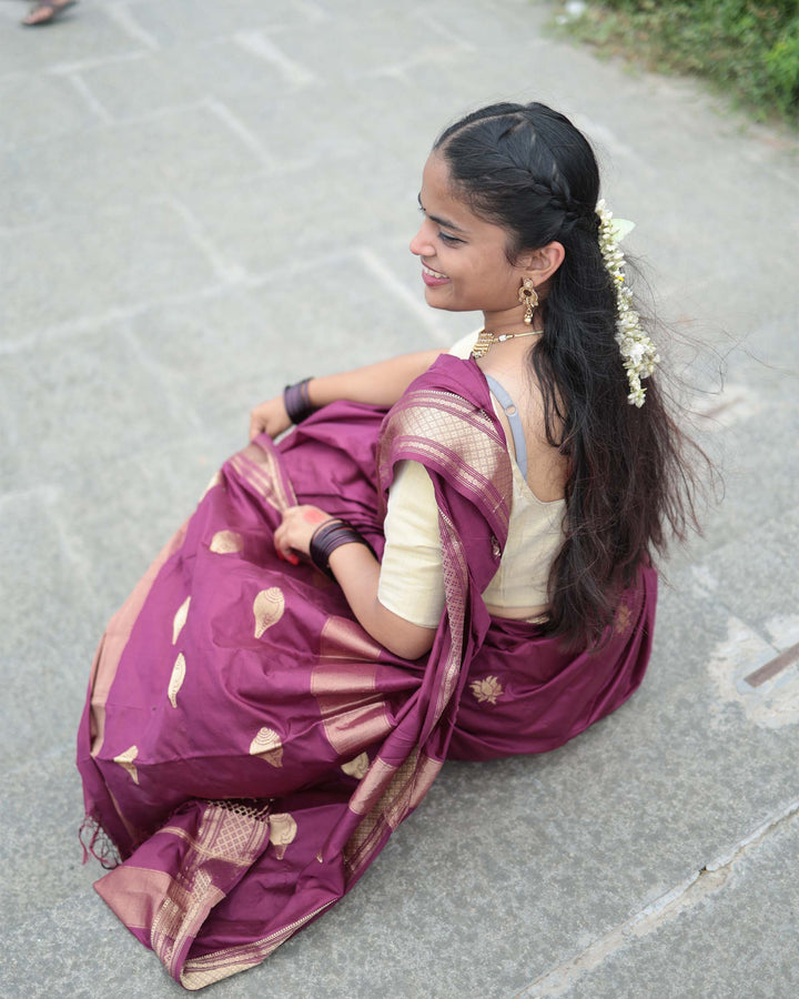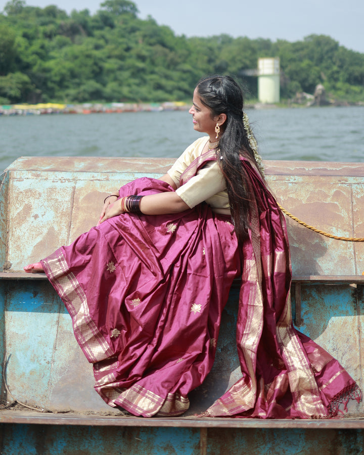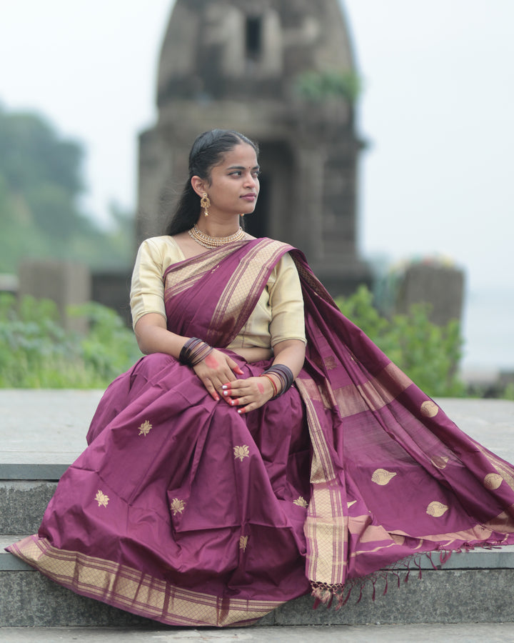 Woven in pure silk by silk, this creation features the timeless lotus and shank motifs — symbols of purity, divinity, and new beginnings. Each thread captures the grace of traditional Maheshwari weaving, where ancient symbolism meets contemporary finesse, creating a piece that’s both sacred and serene.”