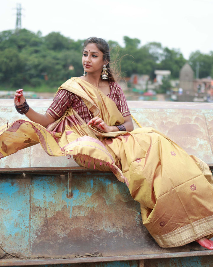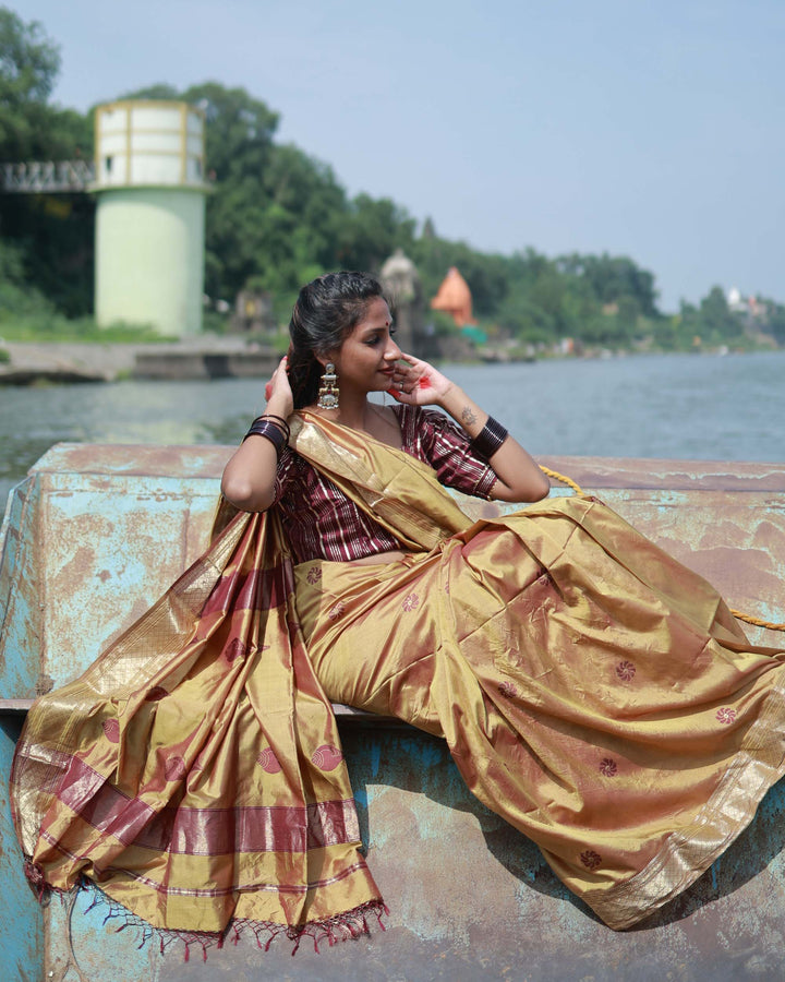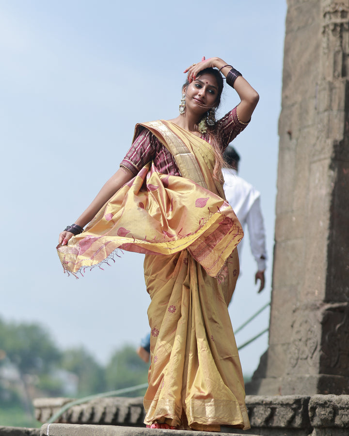 An ode to fine craftsmanship — where every silk thread breathes life into the lotus and shank motifs, shimmering with the grace of Maheshwar’s timeless artistry.”
