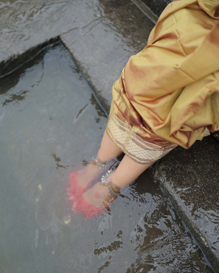 Woven in pure silk by silk, this creation features the timeless lotus and shank motifs — symbols of purity, divinity, and new beginnings. Each thread captures the grace of traditional Maheshwari weaving, where ancient symbolism meets contemporary finesse, creating a piece that’s both sacred and serene.”