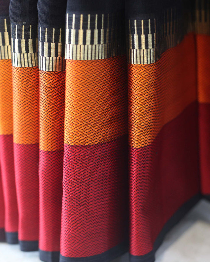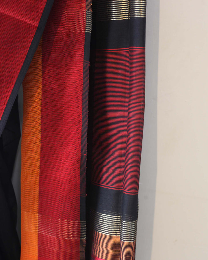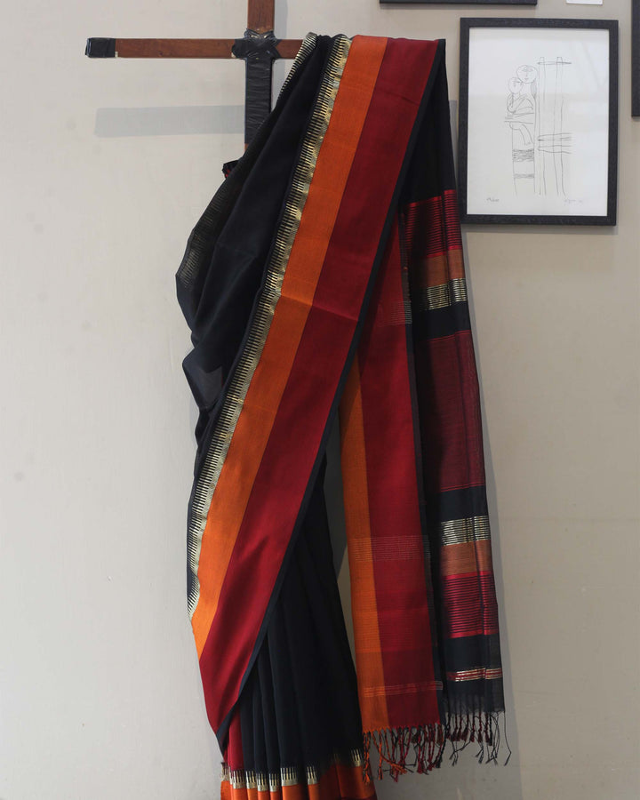 This Maheshwari saree is a beautiful blend of tradition and elegance, crafted from a silk and cotton mix that gives it a lightweight and soft texture, perfect for all-day comfort. The saree features a striking multi-coloured silk border inspired by the classic Ganga Jamuna style of old pattern sarees, adding a timeless touch to its modern design. The vibrant border contrasts gracefully with the rich black body, making this saree ideal for both festive occasions and everyday wear. With its gorgeous colours and sophisticated appeal, this Maheshwari saree effortlessly combines classic craftsmanship with contemporary style.