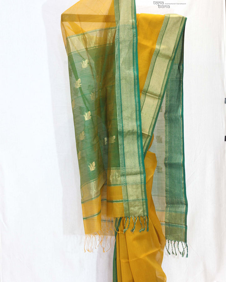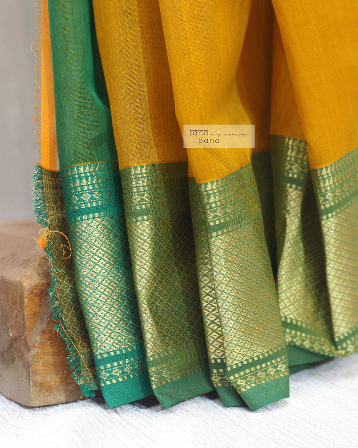 - The saree features a vibrant golden yellow base, complemented by a striking green pallu and borders.