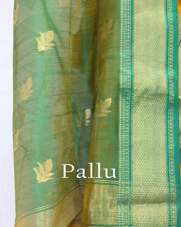 - The pallu is adorned with delicate motifs in gold zari, reflecting classic Maheshwari craftsmanship.