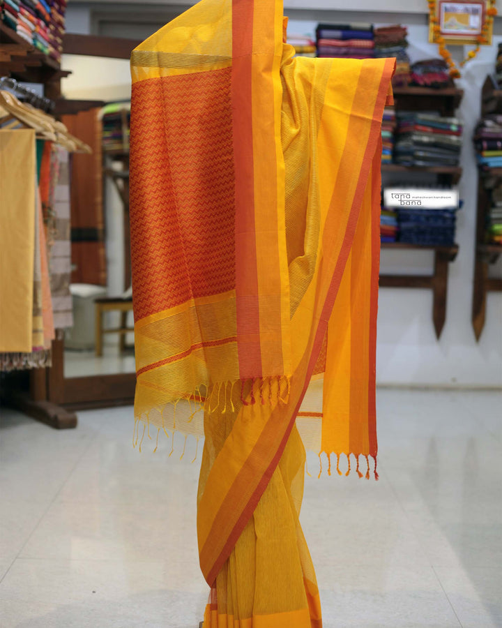 Woven with a reimagined fabric structure, this saree moves beyond the conventional weave, introducing a unique texture and drape that feel both rooted and renewed. Traditional motifs and weaving techniques are thoughtfully balanced with modern sensibilities—making it perfect for those who seek heritage with a hint of experimentation.